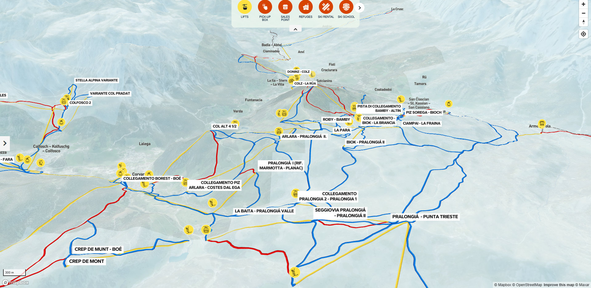The initial lift out of Corvara is the flattish Borest chairlift which acts as a connecting link in both directions, followed by the Sodlisia chairlift. From here the Plans and Frara gondolas head up to a restaurant and the final Val Setus chairlift before the border of the local lift pass is reached. From here it is possible to ski to the small settlement at the Passo Gardena (Grödner Joch) and take a long run down along the side of the road underneath the lifts which have just been used.