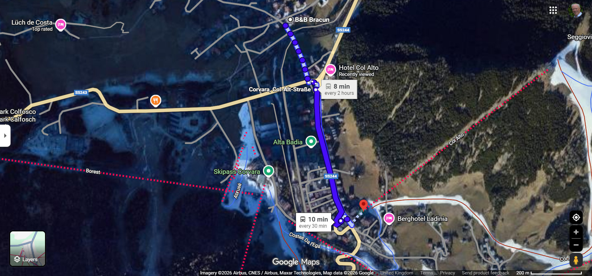 There is a bus at 9.00 which takes 10 minutes to get to the Col Alto lift. To walk the 900 metres suggests is 15 minutes but that is with ski boots.